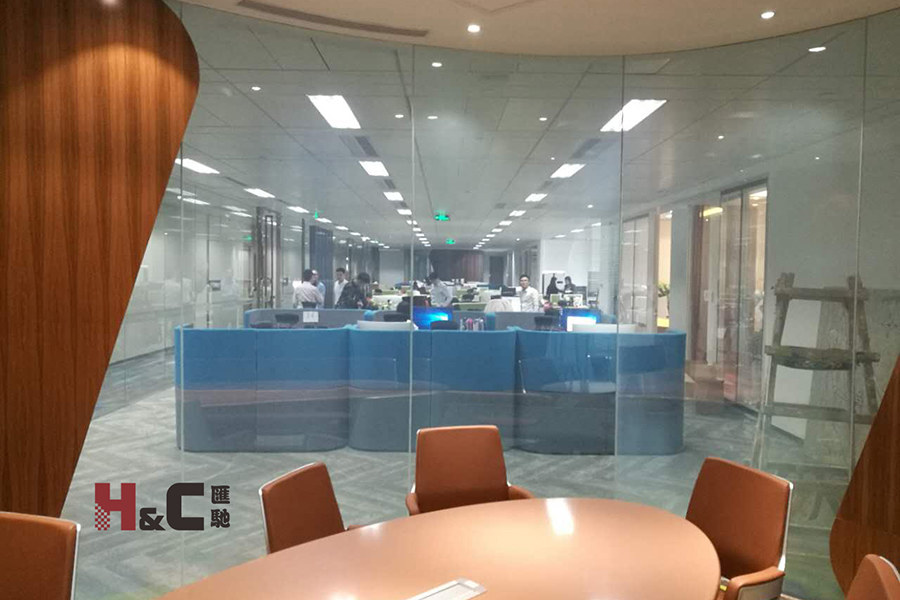 該辦公區域使用調光玻璃的地方很多,原來的一個大空間被分隔為幾個獨立的辦公室和會議室。平玻與彎玻相結合,弧形調光玻璃的圓角設計也與大樓的承重圓柱交相呼映,完美詮釋了高檔辦公室的內涵。