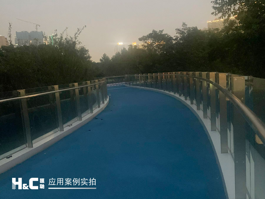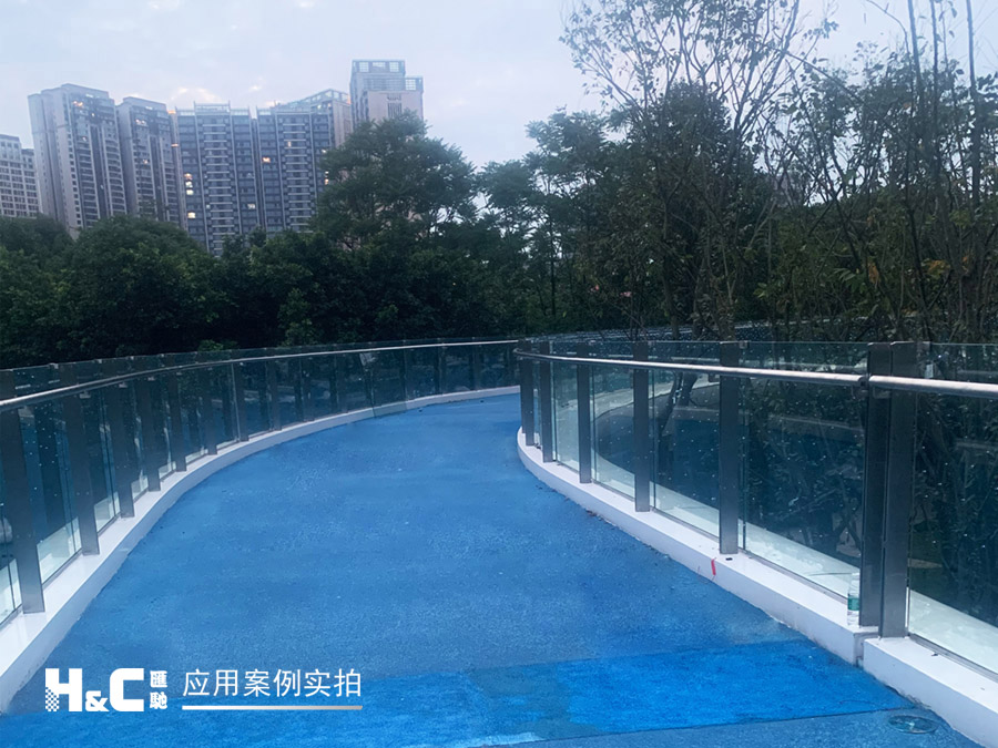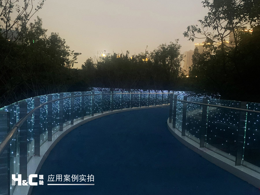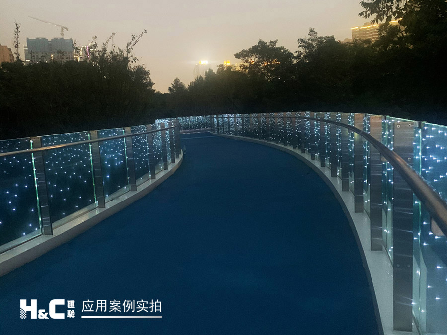 “絲路云錦”有三條跨線橋,外形設計靈感來源于“竹葉輕”,其中一座橋上的護欄采用了匯馳LED發光玻璃。它將單個LED點光源封裝在兩片鋼化安全玻璃中間,并使用隱線工藝,不細看基本看不到線路,這樣既保持了玻璃的透明特性,又可以控制呈現光電效果,創造出美妙的空間,起到獨特的裝飾和調節場景氛圍的作用。