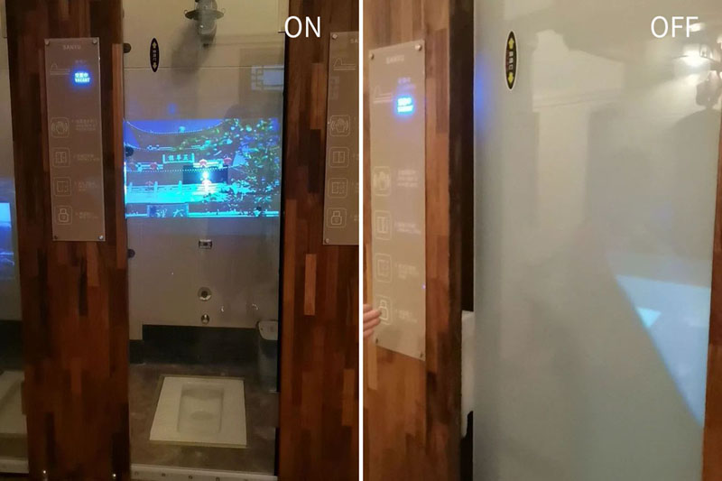 首先,讓人感觸最深的就是廁所的玻璃門,許多不了解的游客都看傻了眼,紛紛感嘆:要不要這么開放?透明的門怎么方便啊?其實(shí),這是連接了感應(yīng)控制系統(tǒng)的調(diào)光玻璃門。沒有人在里面的時候,玻璃門呈透明狀態(tài),讓人一眼就能看到有空位;當(dāng)有人進(jìn)入廁所關(guān)上門后,玻璃門就會由透明瞬間轉(zhuǎn)換為不透明的霧化狀態(tài),里面和外面都互相看不見,但玻璃的透光性良好,在里面的人不會感覺黑暗。