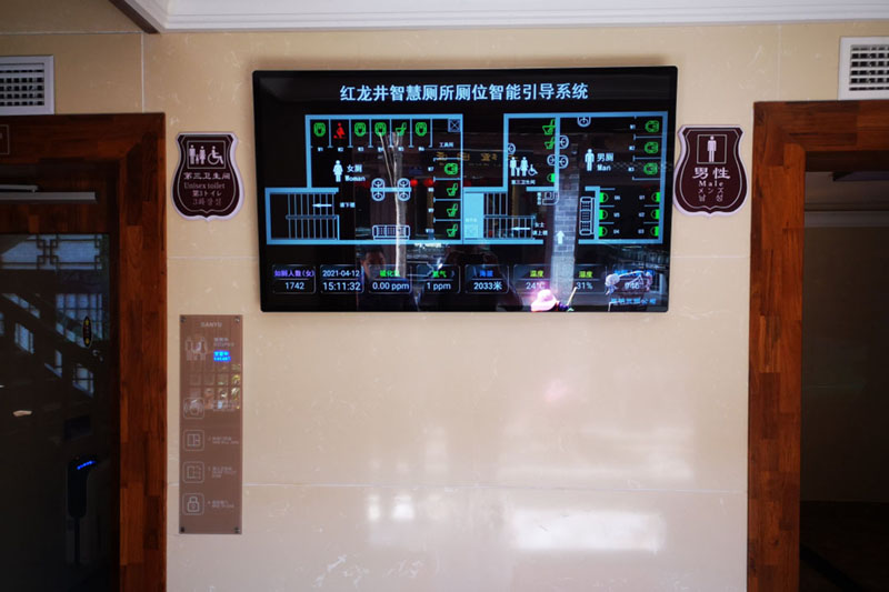 進(jìn)入公廁之后,就能看到正前方的墻上掛著一個電子屏幕,可以查看廁所內(nèi)的空間平面圖和各個廁所分布位置,還可以通過紅綠色的標(biāo)志查看廁位是否正在被使用,有效避免廁所擁擠和排隊(duì)的情況。