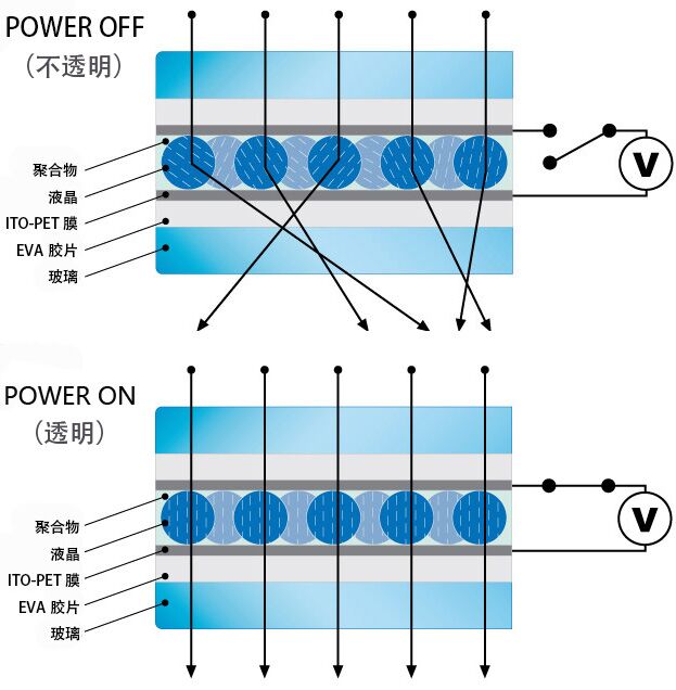 調(diào)光玻璃為“玻璃—膠片—液晶膜—膠片—玻璃”的五層夾膠結(jié)構(gòu),其中ITO-PET膜、聚合物、液晶合并為一層,稱為“液晶膜”層。